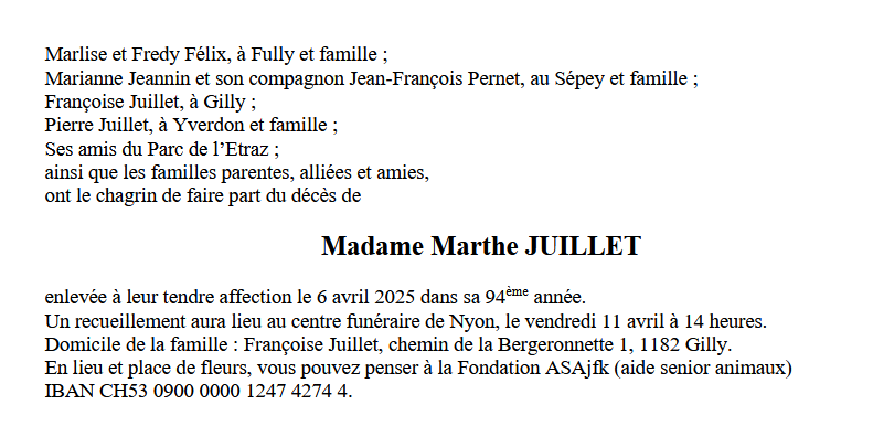 Madame Marthe JUILLET 17 nov. 1931 - 06 avr. 2025 Avis mortuaire PFG Télecharger PDF Partager sur: Galerie