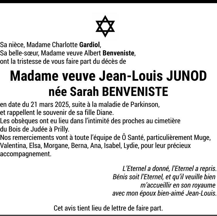 Madame veuve Jean-Louis JUNOD née Sarah BENVENISTE 01 fév. 1934 - 21 mar. 2025 Avis mortuaire PFG Partager sur:
