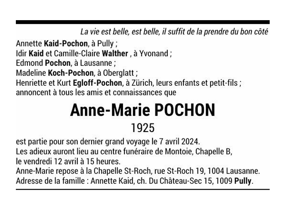 Anne-Marie POCHON 27 sep. 1925 - 07 avr. 2024 Avis mortuaire PFG Télecharger PDF Partager sur: Galerie PreviousNext PreviousNext