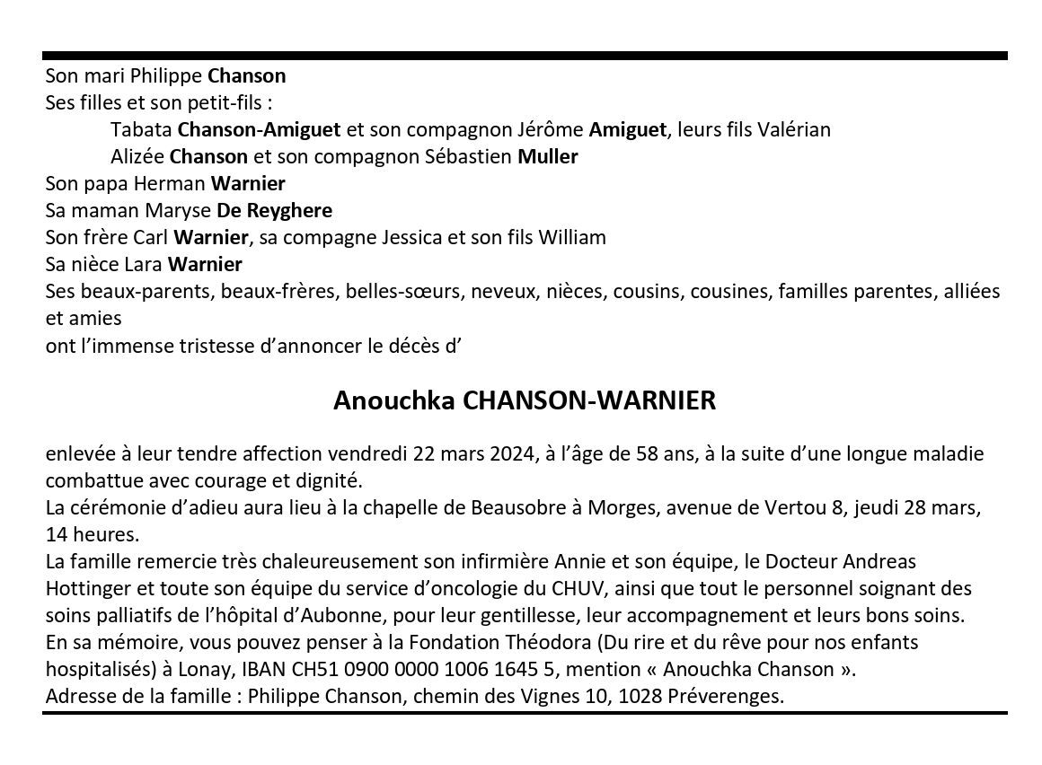 Anouchka CHANSON-WARNIER 07 mar. 1966 - 22 mar. 2024 Avis mortuaire PFG Télecharger PDF Partager sur: Galerie PreviousNext PreviousNext