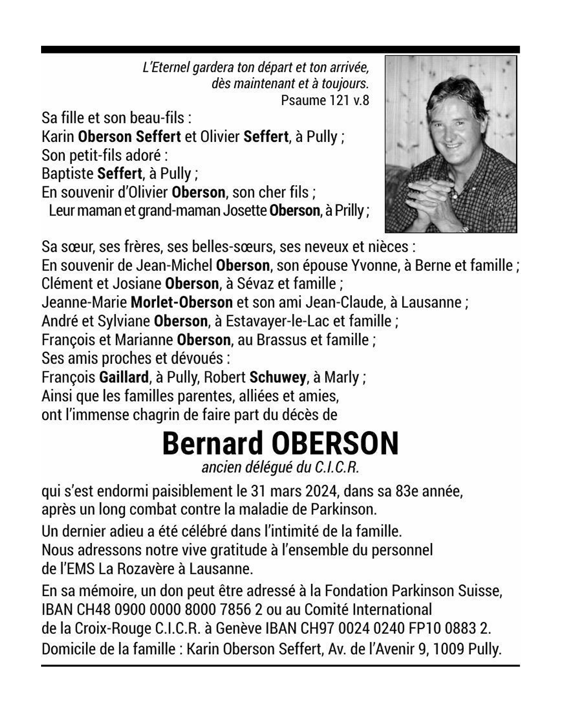 Bernard OBERSON ancien délégué du C.I.C.R. 08 oct. 1941 - 31 mar. 2024 Avis mortuaire PFG Télecharger PDF Partager sur: Galerie PreviousNext PreviousNext