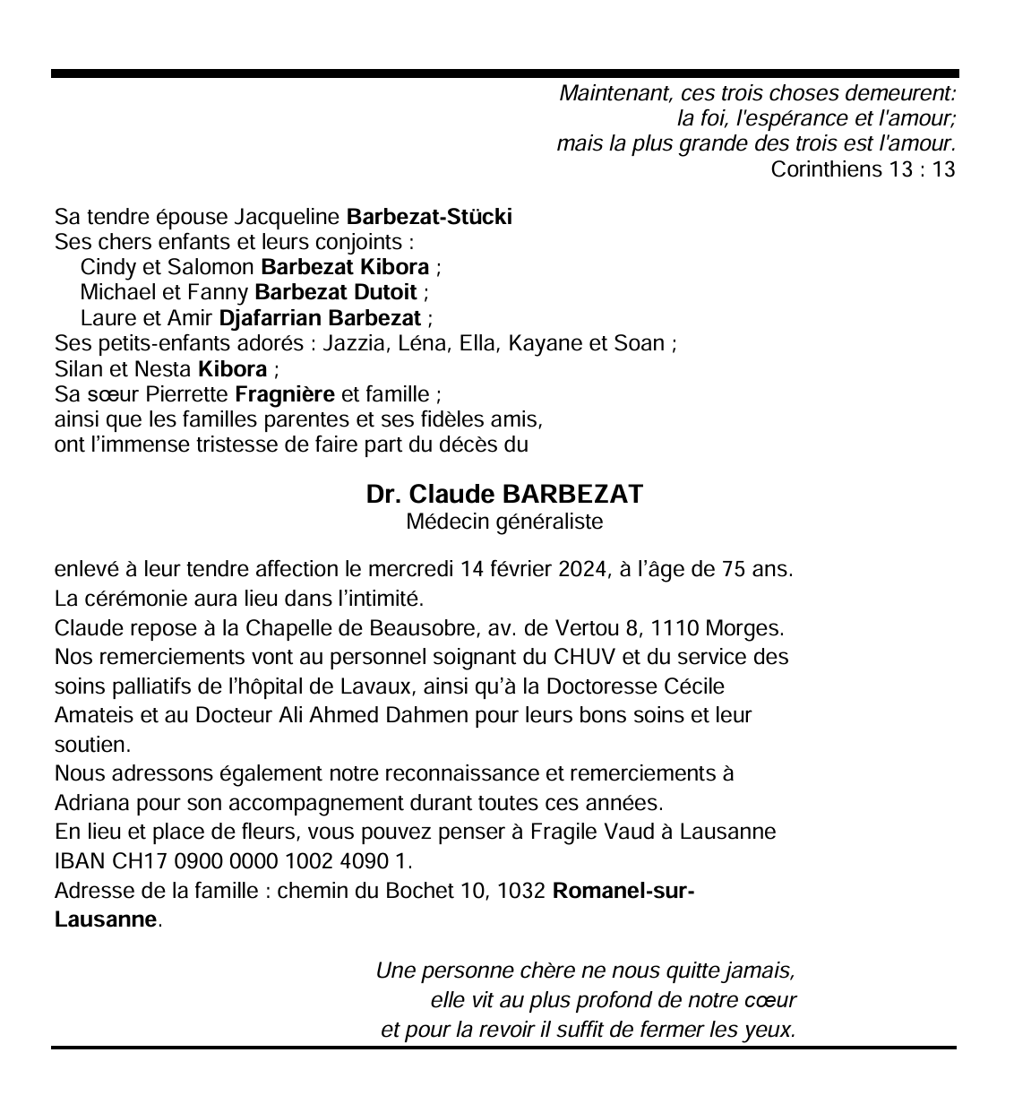 Dr. Claude BARBEZAT Médecin généraliste 23 sep. 1948 - 14 fév. 2024 Avis mortuaire PFG Télecharger PDF Partager sur: Galerie PreviousNext PreviousNext