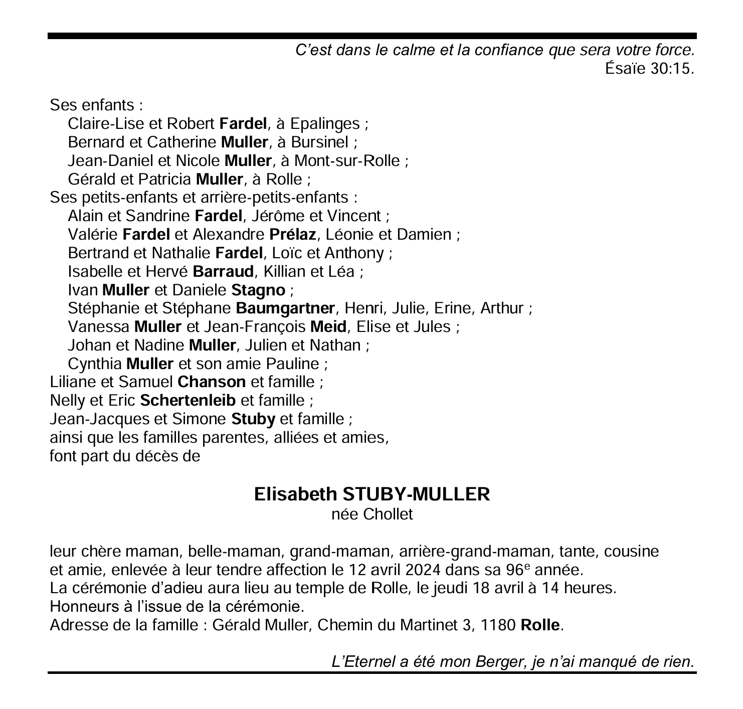 Elisabeth STUBY-MULLER née Chollet 18 déc. 1928 - 12 avr. 2024 Avis mortuaire PFG Télecharger PDF Partager sur: Galerie PreviousNext PreviousNext