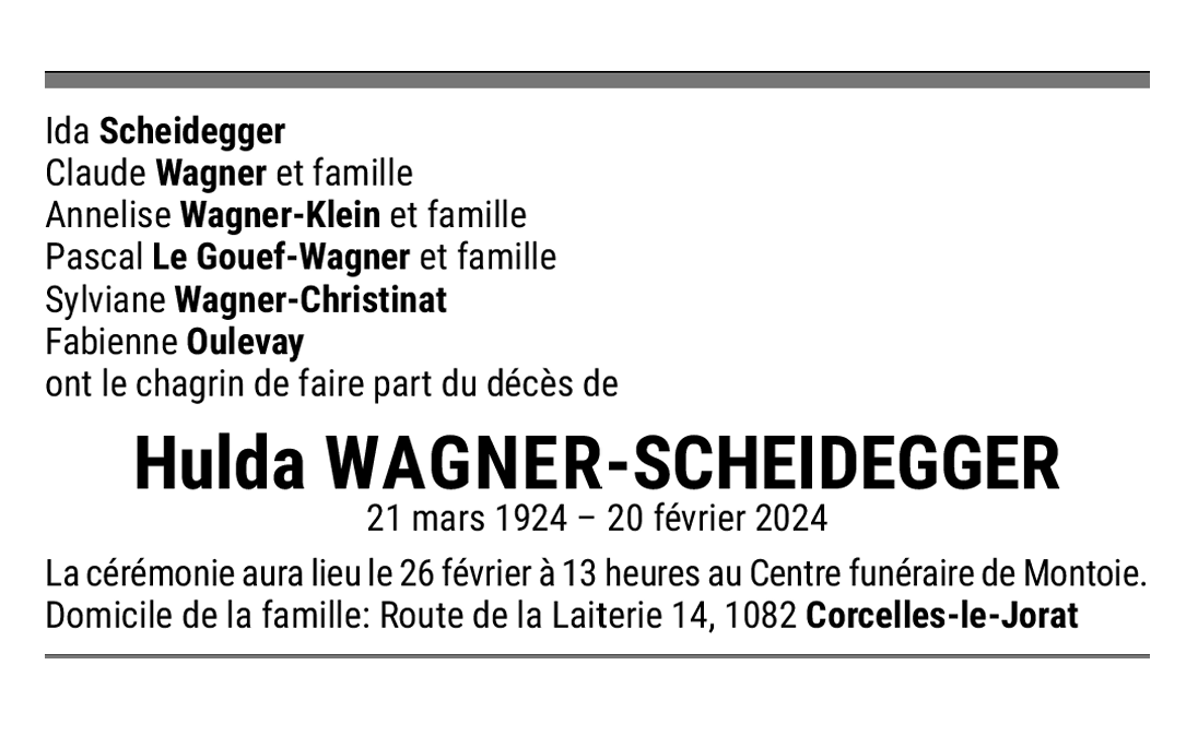 Hulda WAGNER-SCHEIDEGGER 21 mar. 1924 - 20 fév. 2024 Avis mortuaire PFG Télecharger PDF Partager sur: Galerie PreviousNext PreviousNext