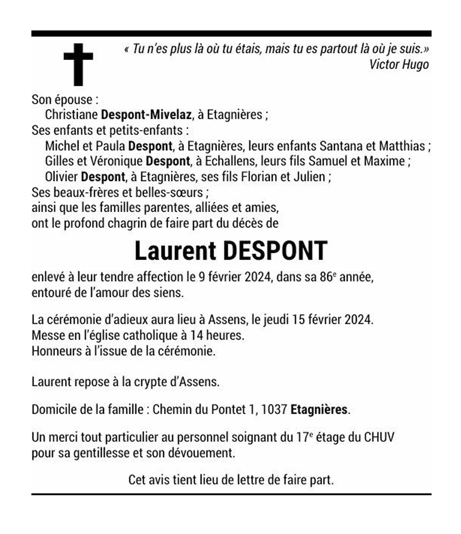 Laurent DESPONT 14 avr. 1938 - 09 fév. 2024 Avis mortuaire PFG Télecharger PDF Partager sur: Galerie PreviousNext PreviousNext