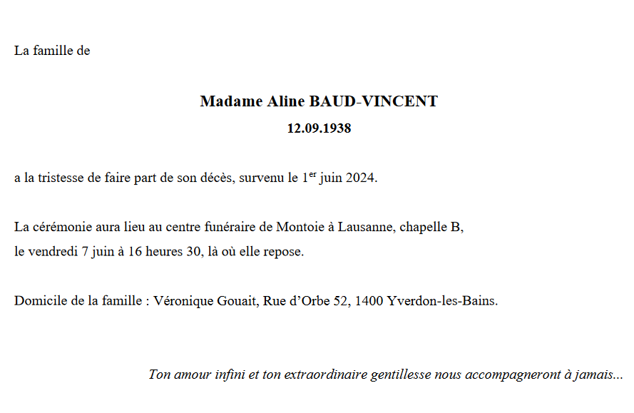 Madame Aline BAUD-VINCENT 12 sep. 1938 - 01 juin. 2024 Avis mortuaire PFG Télecharger PDF Partager sur: Galerie PreviousNext PreviousNext
