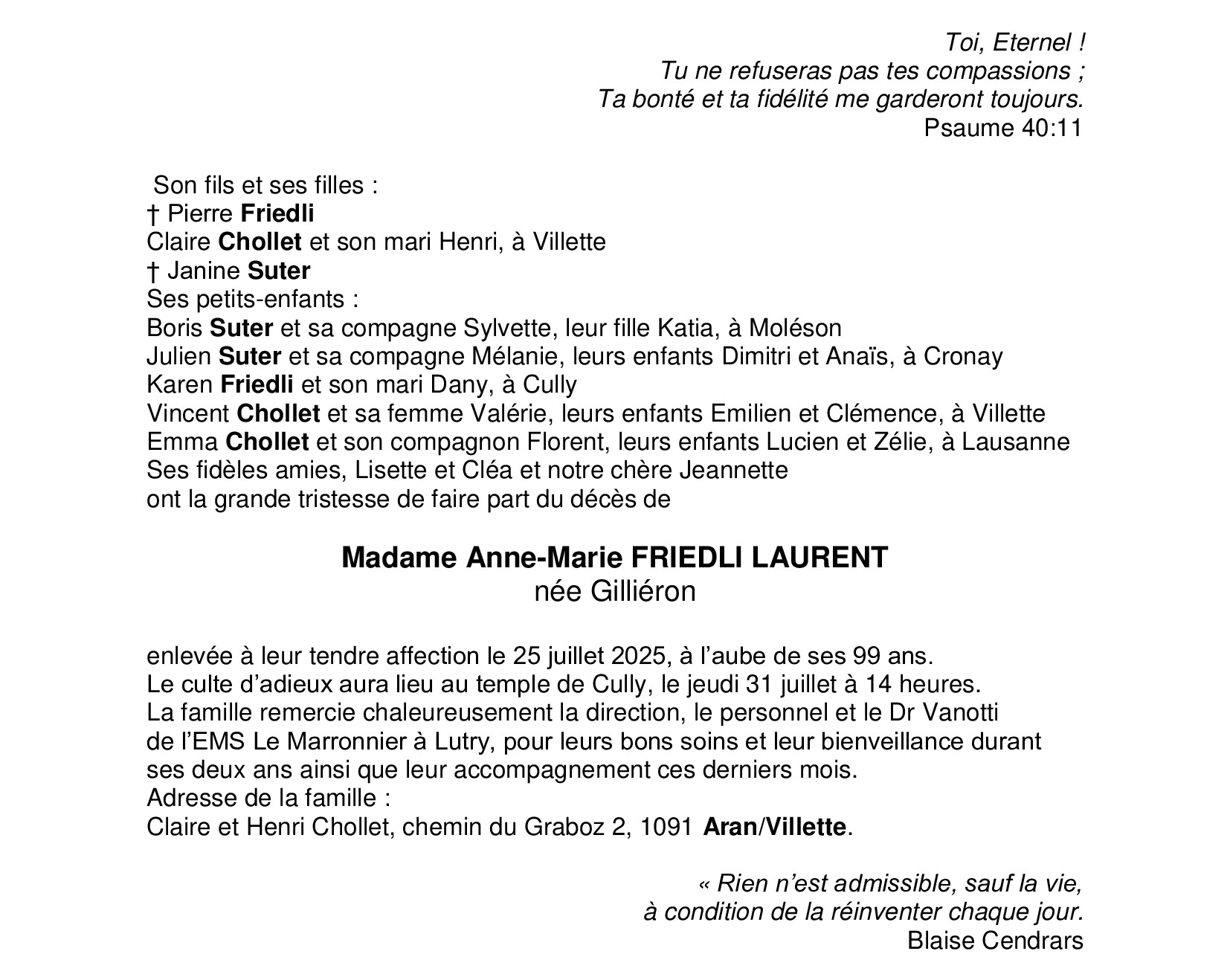 Madame Anne-Marie FRIEDLI LAURENT 23 juil. 1926 - 25 juil. 1925 Avis mortuaire PFG Partager sur: Galerie