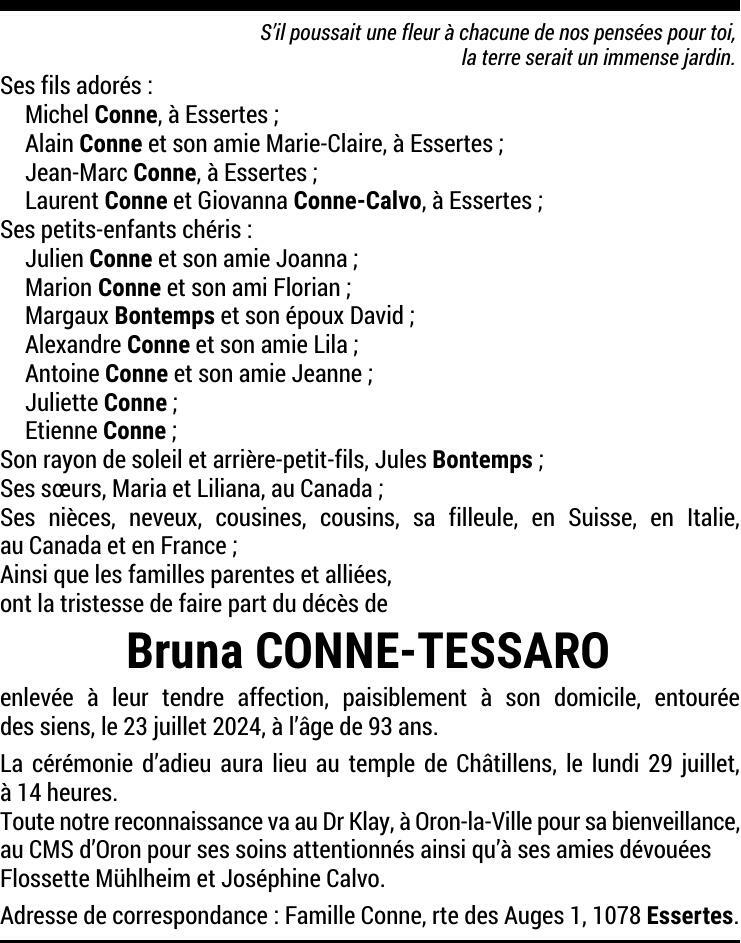 Madame Bruna CONNE-TESSARO 20 juin. 1931 - 23 juil. 2024 Avis mortuaire PFG Partager sur: Galerie PreviousNext PreviousNext