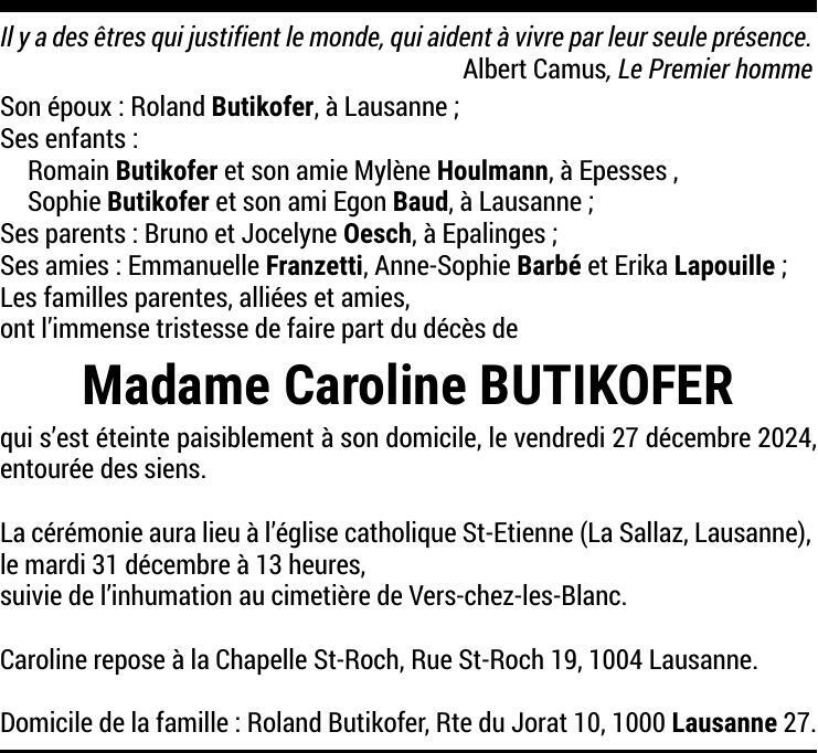 Madame Caroline BUTIKOFER 10 jan. 1964 - 27 déc. 2024 Avis mortuaire PFG Partager sur: Galerie PreviousNext PreviousNext