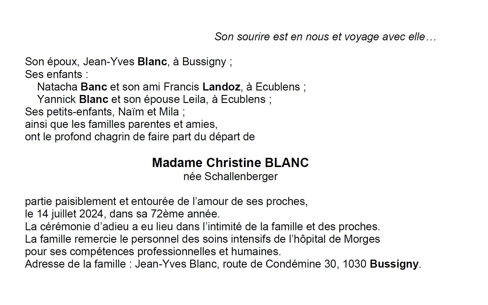 Madame Christine BLANC 18 mar. 1953 - 14 juil. 2024 Avis mortuaire PFG Télecharger PDF Partager sur: Galerie