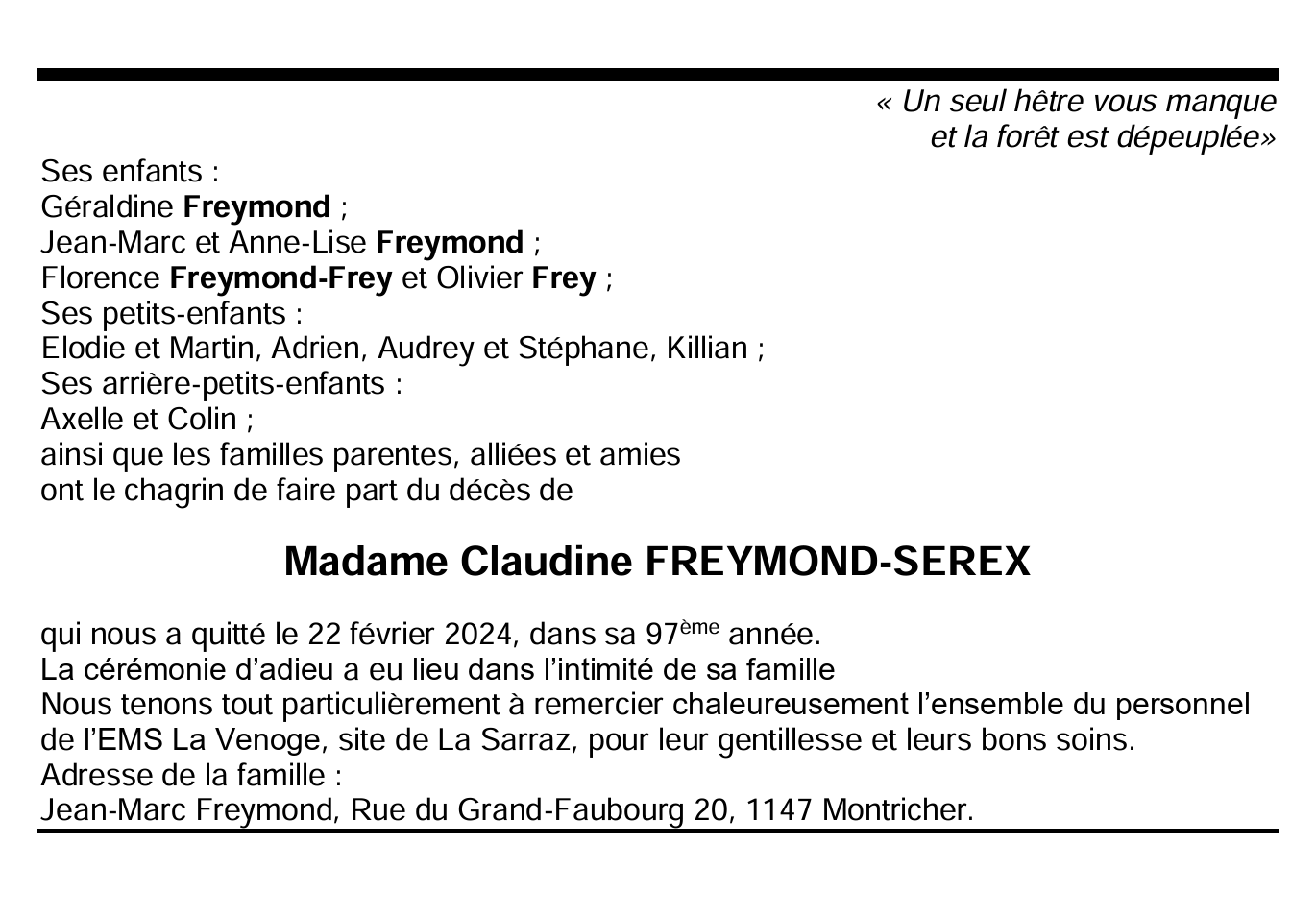Madame Claudine FREYMOND-SEREX 19 aoû. 1927 - 22 fév. 2024 Avis mortuaire PFG Télecharger PDF Partager sur: Galerie PreviousNext PreviousNext