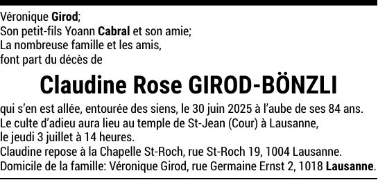Madame Claudine Rose GIROD-BÖNZLI 13 juil. 1941 - 30 juin. 2025 Avis mortuaire PFG Partager sur: Galerie