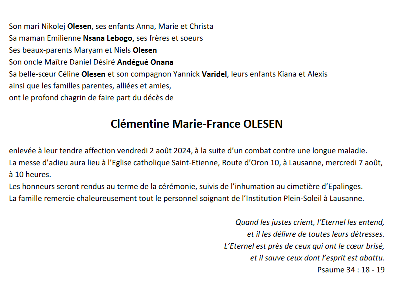 Madame Clémentine Marie-France OLESEN 13 oct. 1978 - 03 aoû. 2024 Avis mortuaire PFG Télecharger PDF Partager sur: Galerie PreviousNext PreviousNext