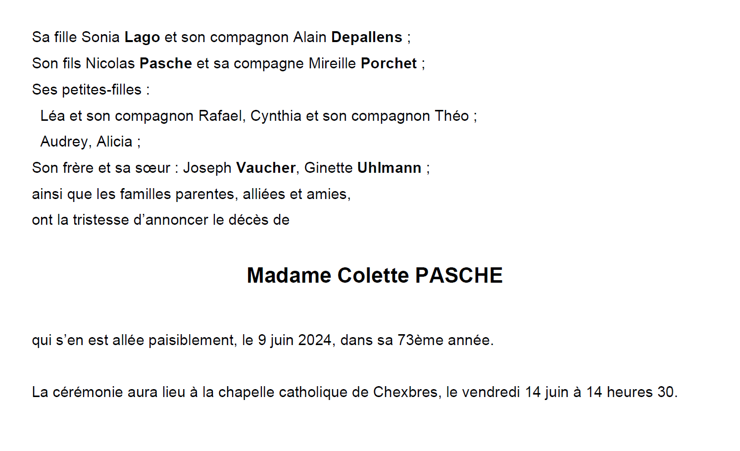 Madame Colette PASCHE 25 juin. 1951 - 09 juin. 2024 Avis mortuaire PFG Télecharger PDF Partager sur: Galerie PreviousNext PreviousNext