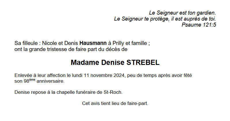 Madame Denise STREBEL 29 oct. 1926 - 11 nov. 2024 Avis mortuaire PFG Télecharger PDF Partager sur: Galerie