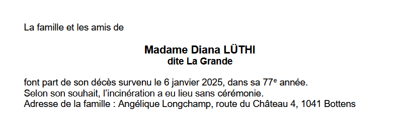 Madame Diana LÜTHI 23 mai. 1948 - 06 jan. 2025 Avis mortuaire PFG Télecharger PDF Partager sur: Galerie