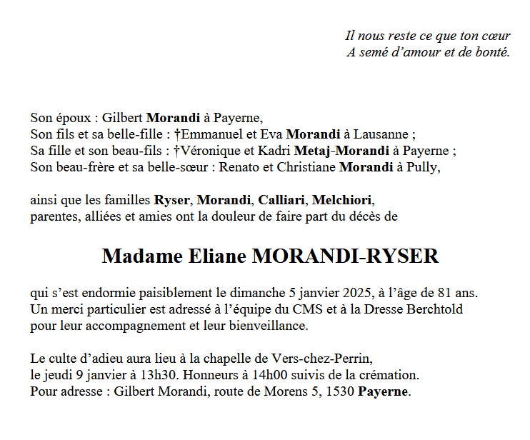 Madame Eliane MORANDI-RYSER 20 mar. 1943 - 05 jan. 2025 Avis mortuaire PFG Télecharger PDF Partager sur: Galerie PreviousNext PreviousNext