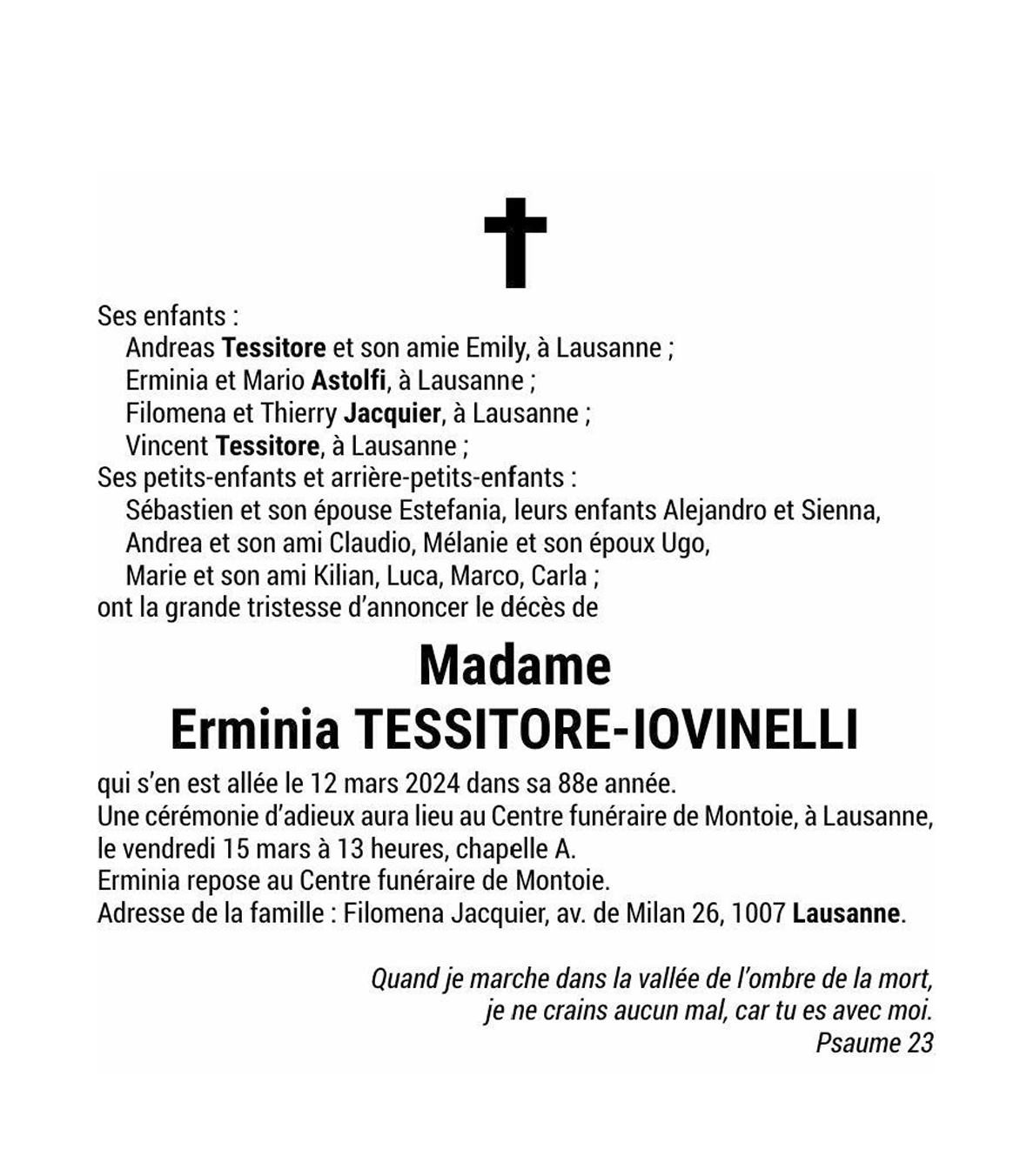 Madame Erminia TESSITORE-IOVINELLI 14 sep. 1936 - 12 mar. 2024 Avis mortuaire PFG Télecharger PDF Partager sur: Galerie PreviousNext PreviousNext