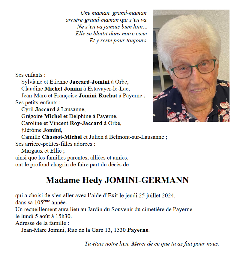 Madame Hedy JOMINI-GERMANN 26 fév. 1920 - 25 juil. 2024 Avis mortuaire PFG Télecharger PDF Partager sur: Galerie
