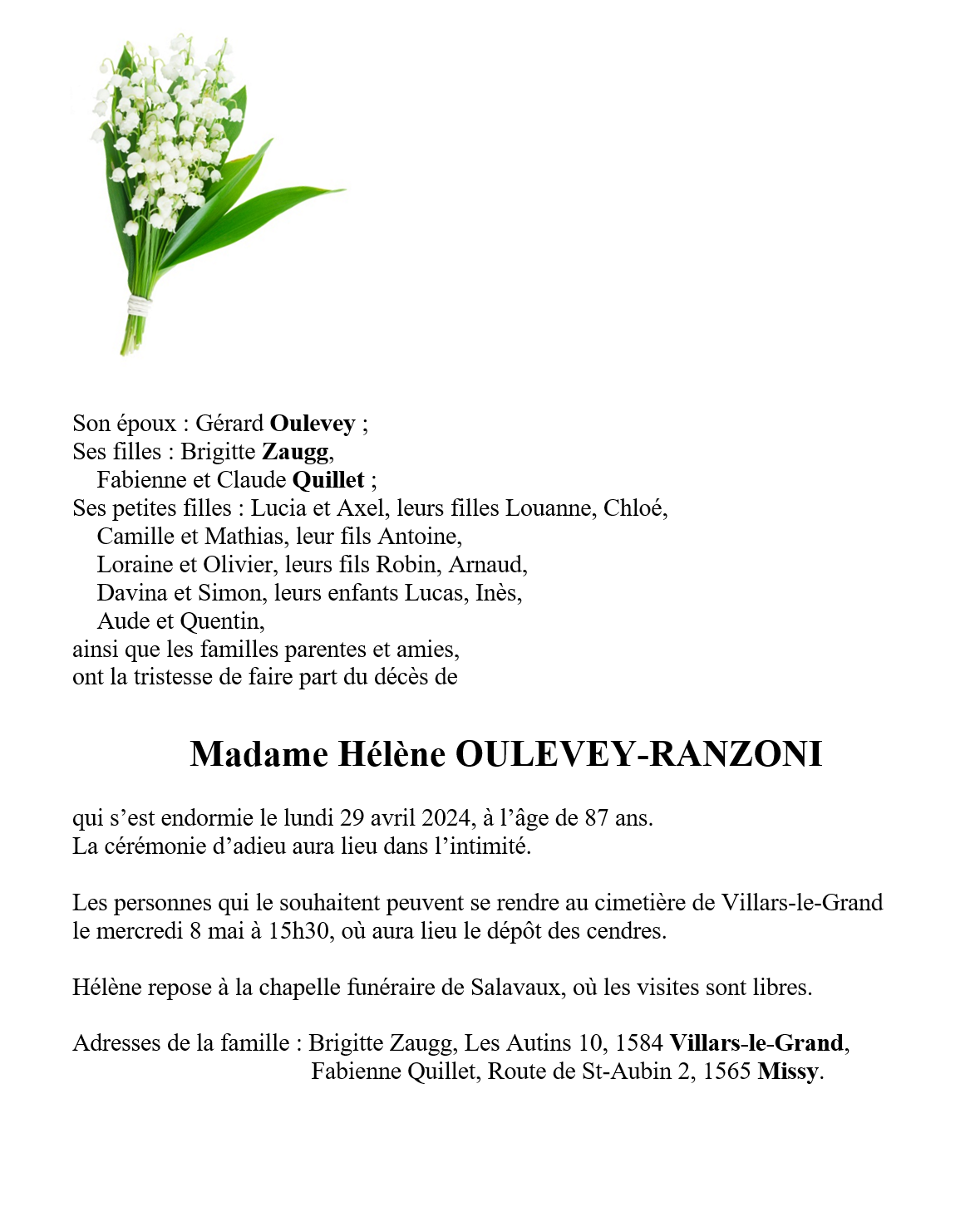 Madame Hélène OULEVEY-RANZONI 24 avr. 1937 - 29 avr. 2024 Avis mortuaire PFG Télecharger PDF Partager sur: Galerie