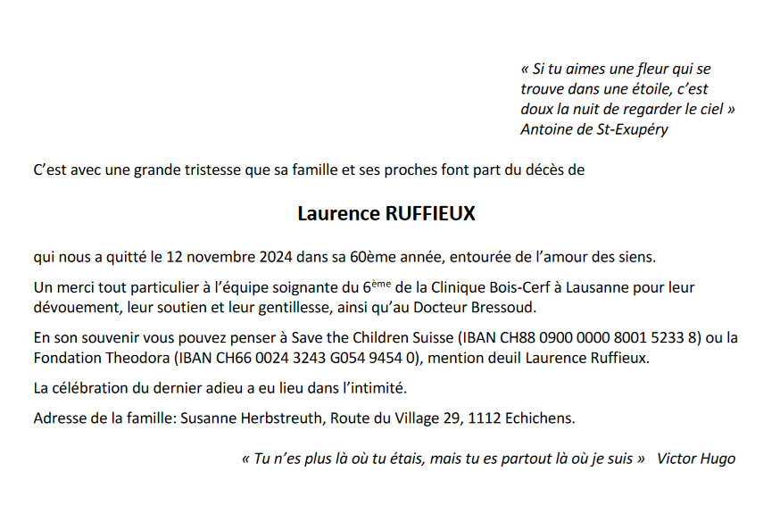 Madame Laurence RUFFIEUX 18 oct. 1965 - 12 nov. 2024 Avis mortuaire PFG Télecharger PDF Partager sur: Galerie