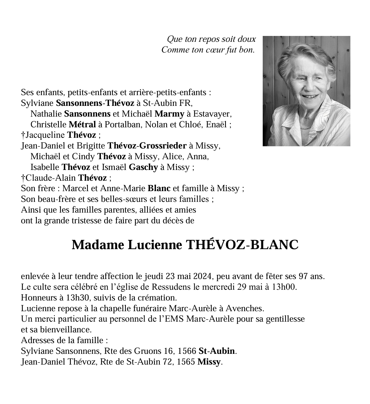 Madame Lucienne THÉVOZ-BLANC 30 juin. 1927 - 23 mai. 2024 Avis mortuaire PFG Télecharger PDF Partager sur: Galerie
