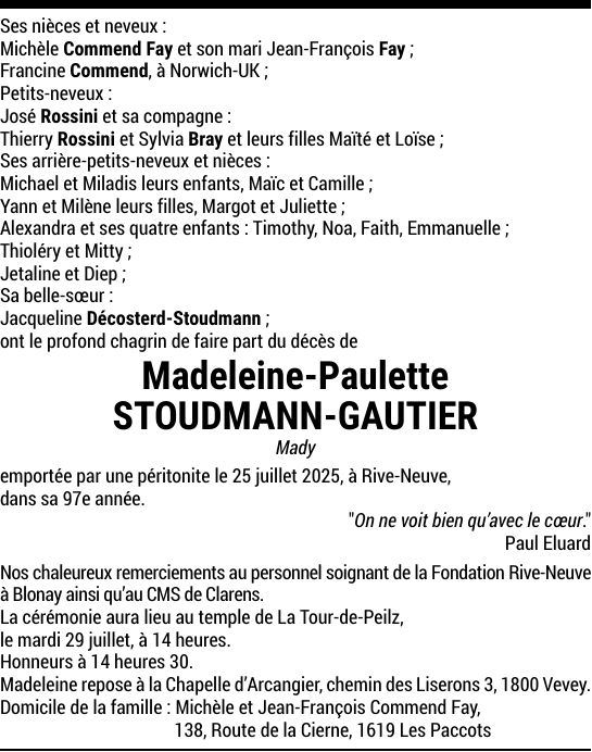 Madame Madeleine-Paulette STOUDMANN-GAUTIER 16 juil. 1929 - 25 juil. 2025 Avis mortuaire PFG Partager sur: