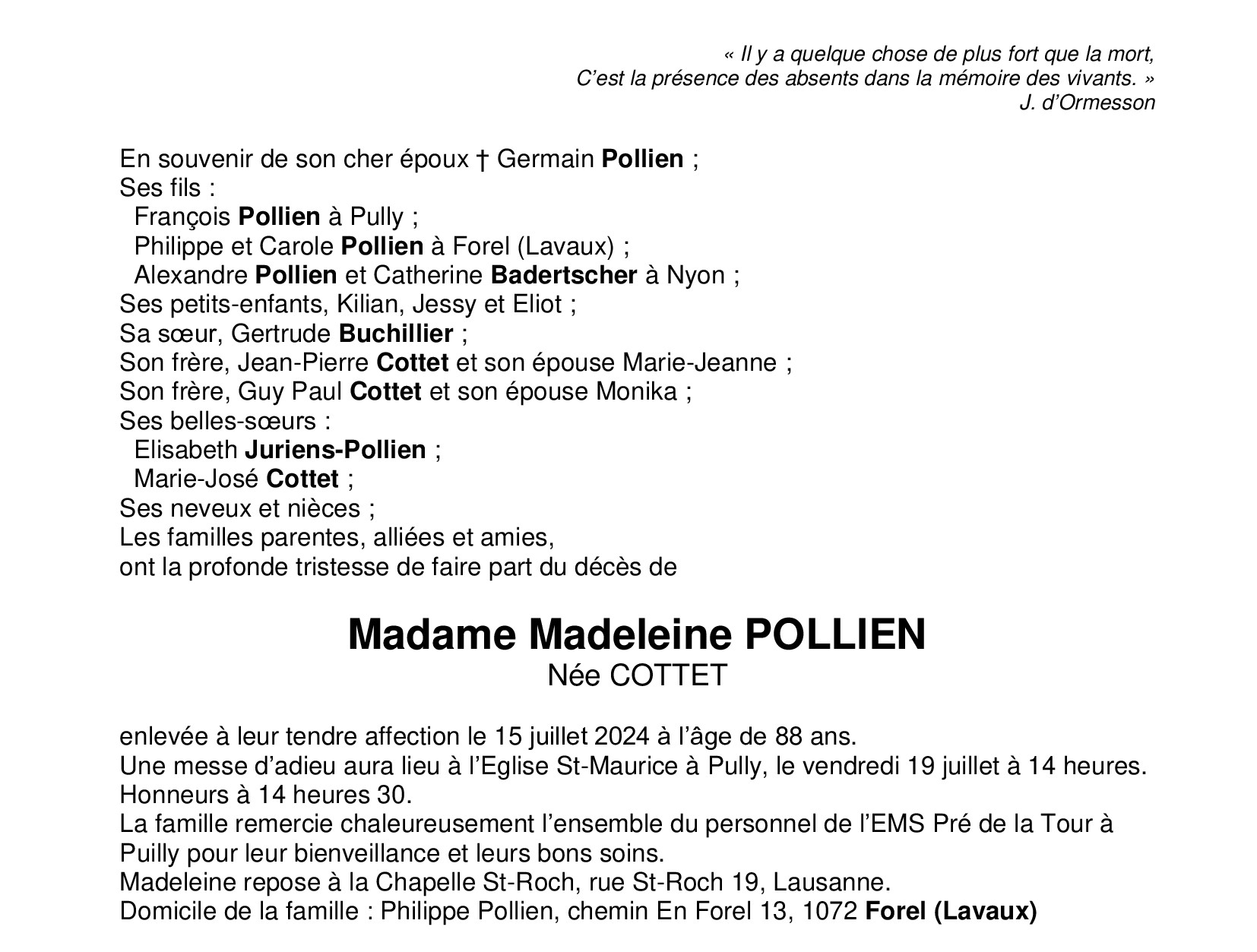 Madame Madeleine POLLIEN 12 fév. 1936 - 15 juil. 2024 Avis mortuaire PFG Partager sur: Galerie PreviousNext PreviousNext