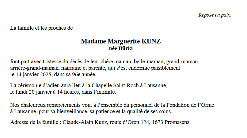 Madame Marguerite KUNZ 06 oct. 1929 - 14 jan. 2025 Avis mortuaire PFG Télecharger PDF Partager sur: Galerie