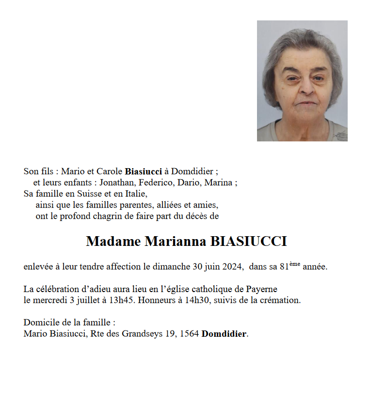 Madame Marianna BIASIUCCI 23 sep. 1943 - 30 juin. 2024 Avis mortuaire PFG Télecharger PDF Partager sur: Galerie PreviousNext PreviousNext