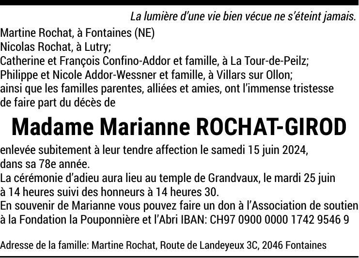 Madame Marianne ROCHAT-GIROUD 11 jan. 1947 - 15 juin. 2024 Avis mortuaire PFG Partager sur: Galerie PreviousNext PreviousNext