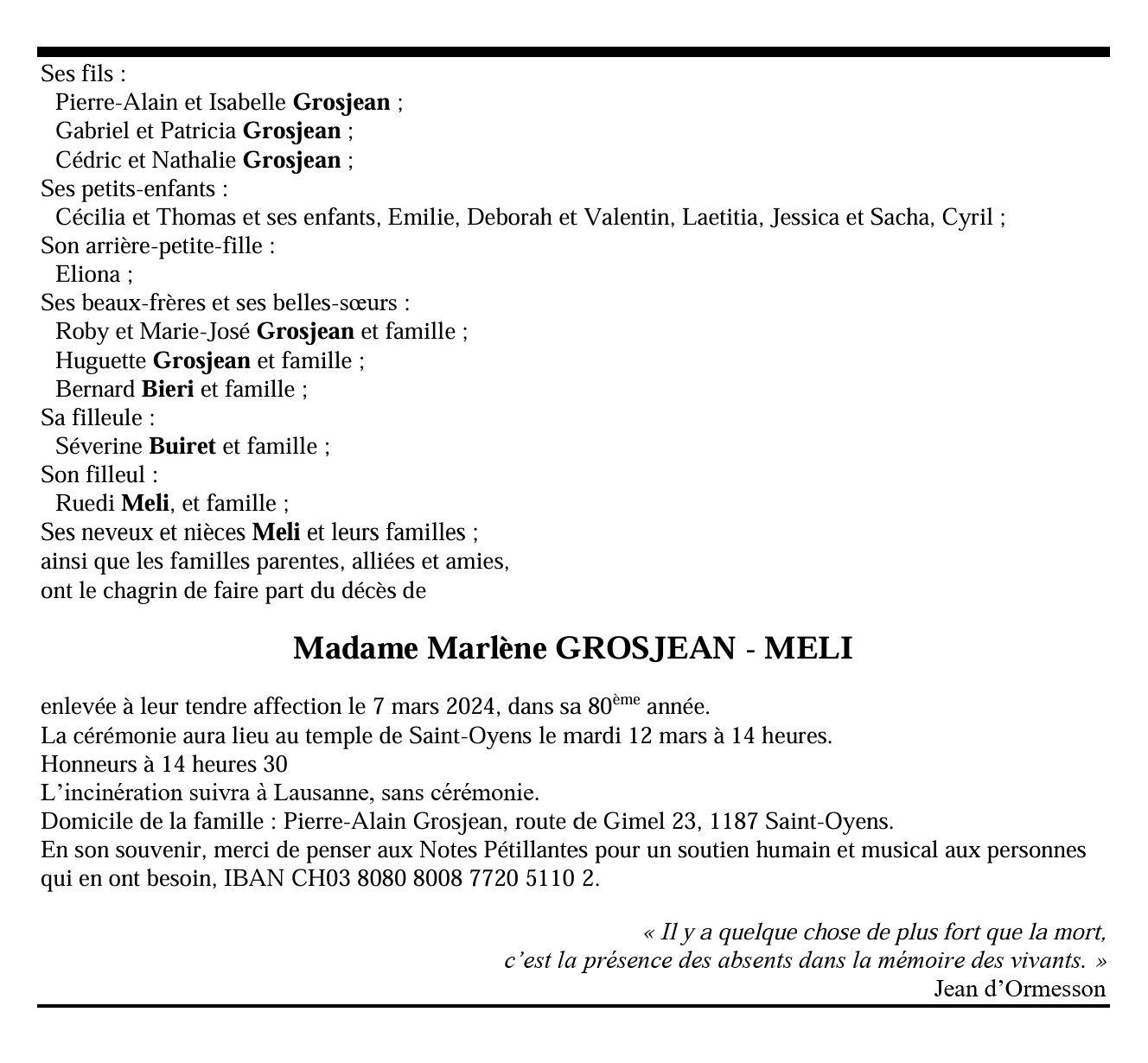 Madame Marlène GROSJEAN - MELI 22 oct. 1944 - 07 mar. 2024 Avis mortuaire PFG Télecharger PDF Partager sur: Galerie PreviousNext PreviousNext