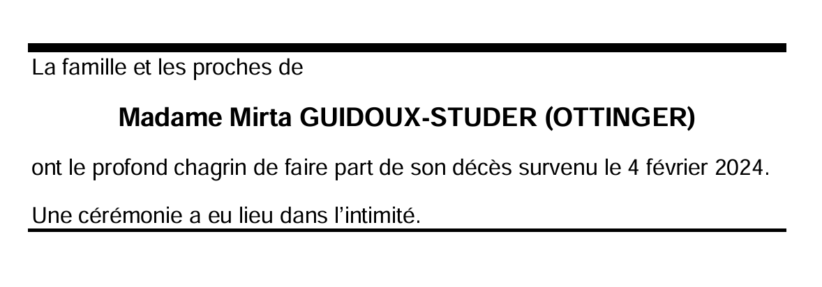 Madame Mirta GUIDOUX-STUDER (OTTINGER) 23 fév. 1941 - 04 fév. 2024 Avis mortuaire PFG Télecharger PDF Partager sur: Galerie PreviousNext PreviousNext