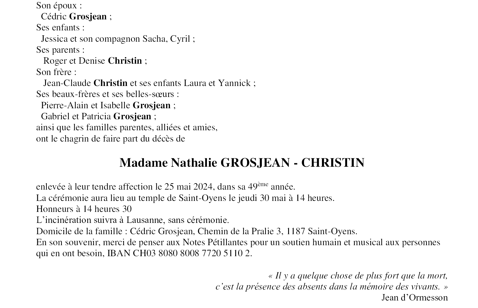 Madame Nathalie GROSJEAN-CHRISTIN 29 juil. 1975 - 25 mai. 2024 Avis mortuaire PFG Partager sur: Galerie PreviousNext PreviousNext