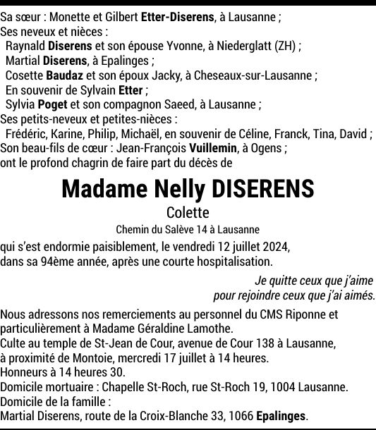 Madame Nelly DISERENS 25 nov. 1930 - 12 juil. 2024 Avis mortuaire PFG Partager sur: Galerie PreviousNext PreviousNext