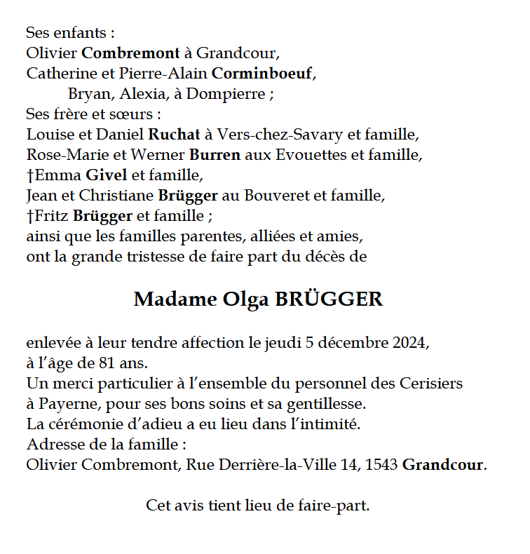 Madame Olga BRÜGGER 23 nov. 1943 - 05 déc. 2024 Avis mortuaire PFG Télecharger PDF Partager sur: Galerie