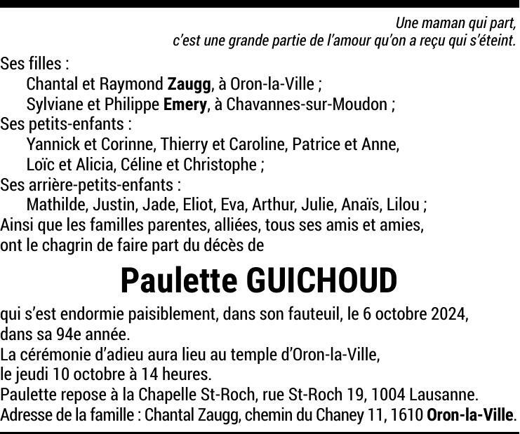 Madame Paulette GUICHOUD 16 nov. 1930 - 08 oct. 2024 Avis mortuaire PFG Partager sur: Galerie PreviousNext PreviousNext