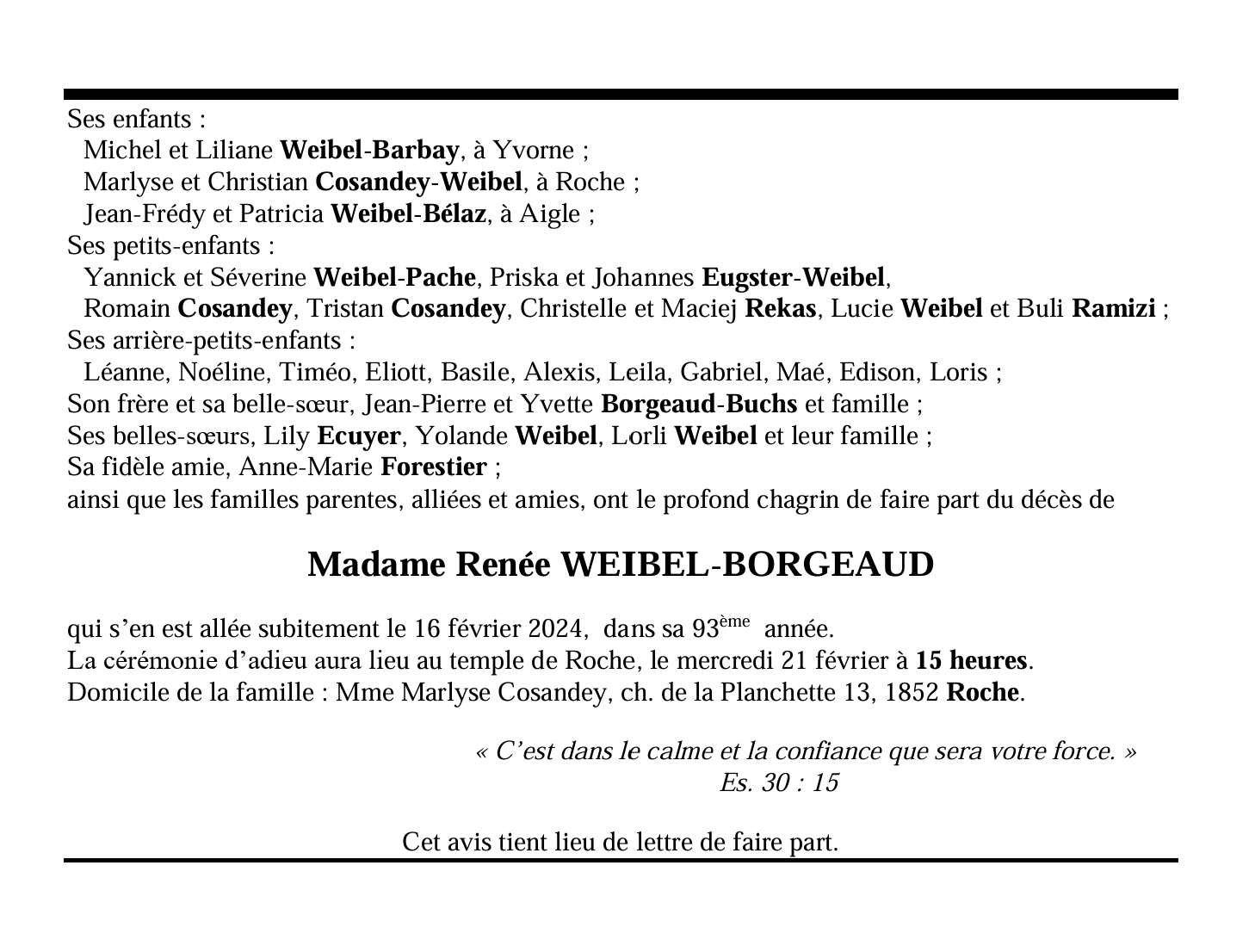 Madame Renée WEIBEL-BORGEAUD 21 oct. 1931 - 16 fév. 2024 Avis mortuaire PFG Télecharger PDF Partager sur: Galerie PreviousNext PreviousNext
