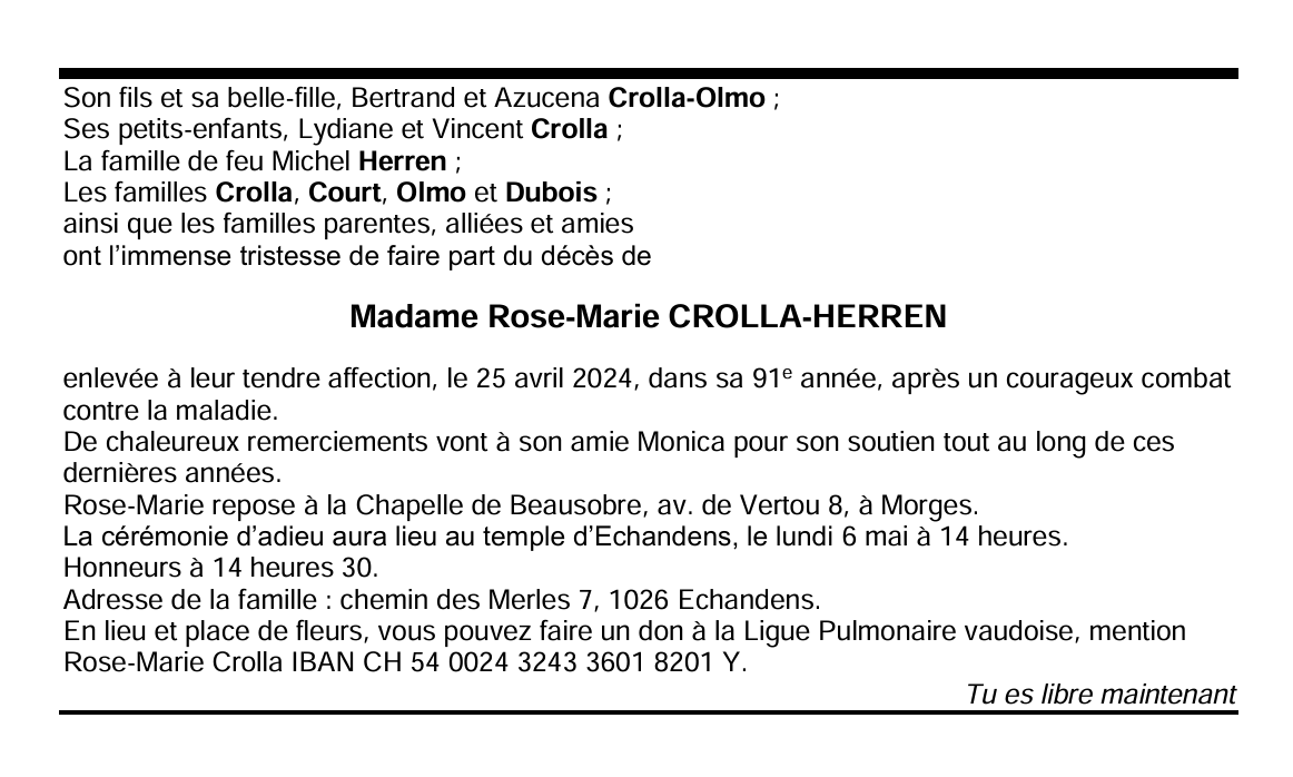 Madame Rose-Marie CROLLA-HERREN 25 juin. 1933 - 25 avr. 2024 Avis mortuaire PFG Télecharger PDF Partager sur: Galerie PreviousNext PreviousNext