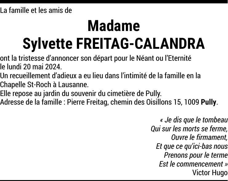 Madame Sylvette FREITAG-CALANDRA 30 déc. 1927 - 20 mai. 2024 Avis mortuaire PFG Partager sur: Galerie PreviousNext PreviousNext