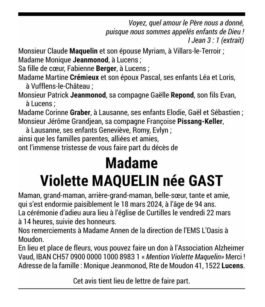 Madame Violette MAQUELIN née GAST 06 juil. 1930 - 18 mar. 2024 Avis mortuaire PFG Télecharger PDF Partager sur: Galerie PreviousNext PreviousNext