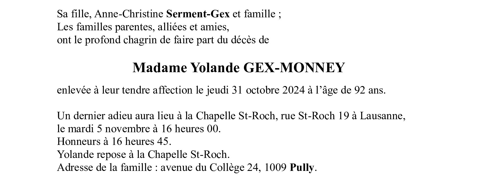 Madame Yolande GEX-MONNEY