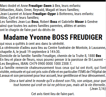 Madame Yvonne BOSS FREUDIGER 06 juin. 1924 - 11 sep. 2024 Avis mortuaire PFG Télecharger PDF Partager sur: Galerie PreviousNext PreviousNext