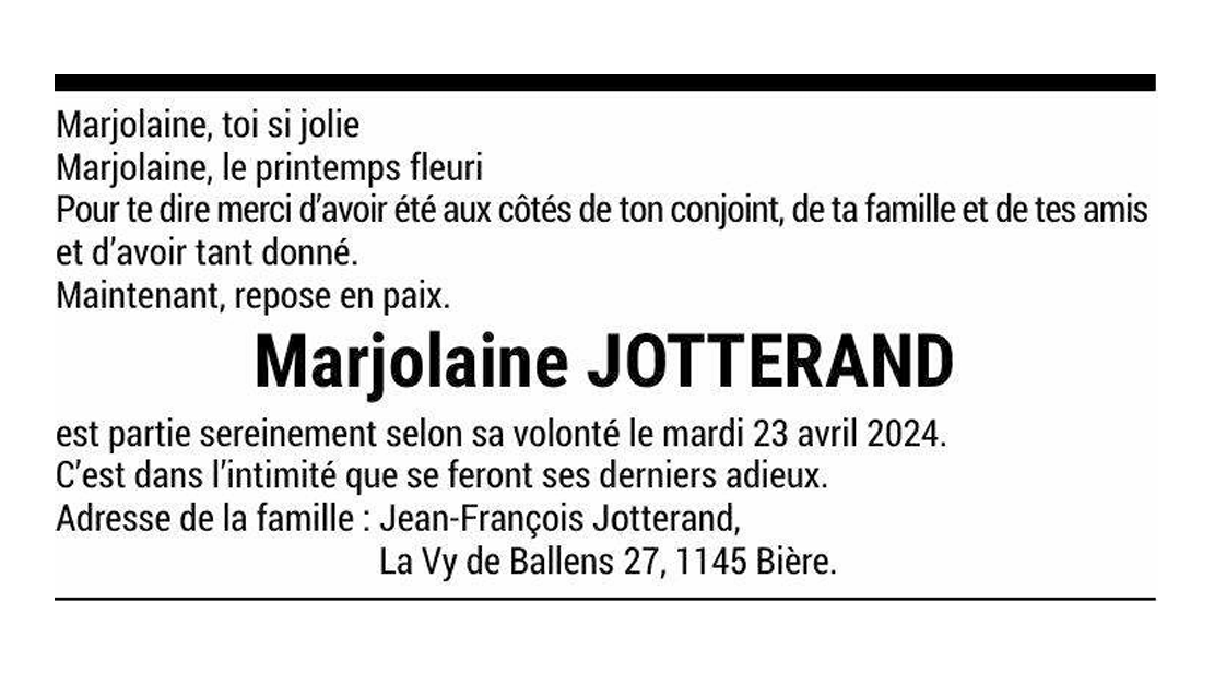Marjolaine JOTTERAND 30 jan. 1944 - 23 avr. 2024 Avis mortuaire PFG Télecharger PDF Partager sur: Galerie PreviousNext PreviousNext