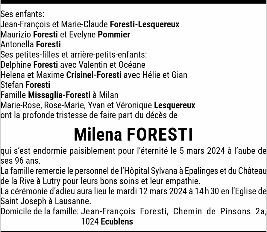 Milena FORESTI 11 avr. 1928 - 05 mar. 2024 Avis mortuaire PFG Télecharger PDF Partager sur: Galerie PreviousNext PreviousNext