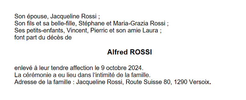 Monsieur Alfred ROSSI 17 déc. 1938 - 09 oct. 2024 Avis mortuaire PFG Télecharger PDF Partager sur: Galerie
