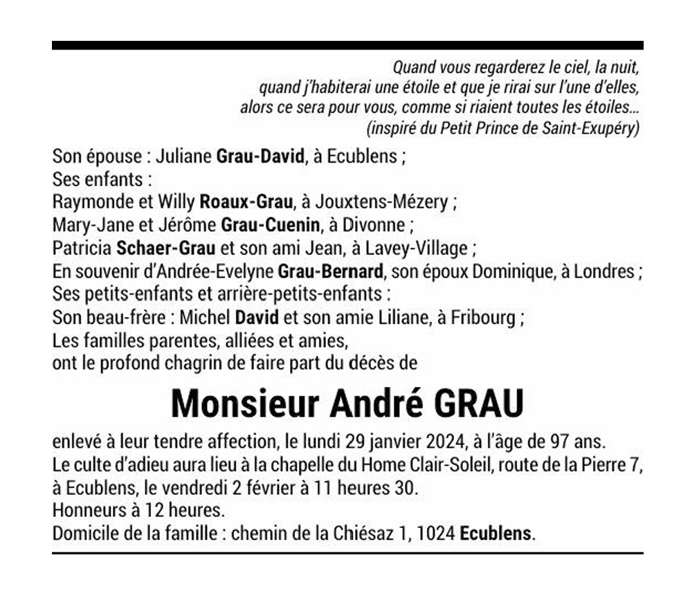 Monsieur André GRAU 04 jan. 1927 - 29 jan. 2024 Avis mortuaire PFG Télecharger PDF Partager sur: Galerie
