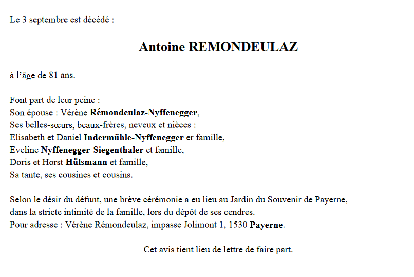 Monsieur Antoine REMONDEULAZ 15 juin. 1943 - 03 sep. 2024 Avis mortuaire PFG Télecharger PDF Partager sur: Galerie