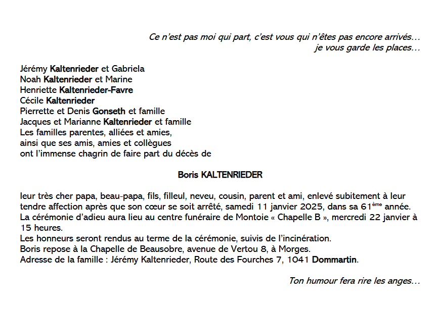 Monsieur Boris KALTENRIEDER 24 nov. 1964 - 11 jan. 2025 Avis mortuaire PFG Télecharger PDF Partager sur: Galerie