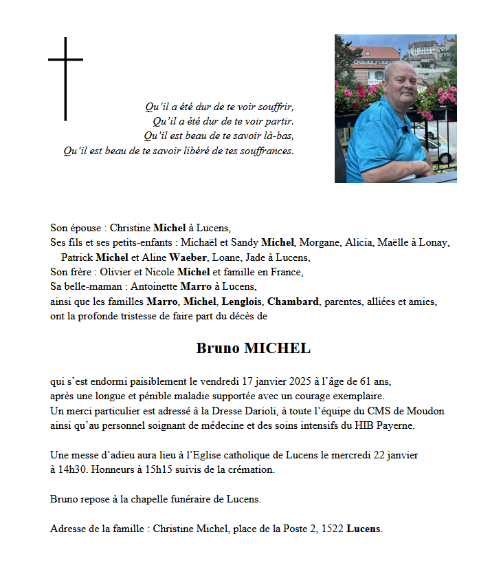 Monsieur Bruno MICHEL 06 déc. 1963 - 17 jan. 2025 Avis mortuaire PFG Télecharger PDF Partager sur: Galerie PreviousNext PreviousNext